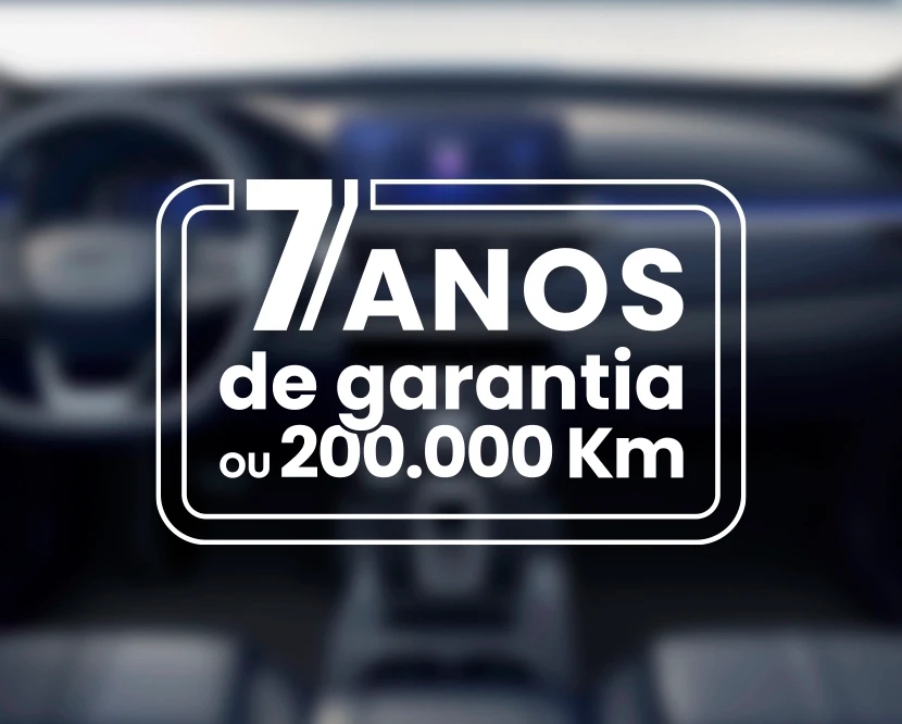 Todos os veículos Chery têm uma garantia abrangente de 7 anos ou 200 000 km (o que ocorrer primeiro). Isso proporciona proteção a longo prazo e verdadeira tranquilidade. É o nosso compromisso com a qualidade que incorporamos em cada veículo, para que possa desfrutar da condução, com a confiança de que estamos ao lado do seu Chery por muitos anos e quilómetros.